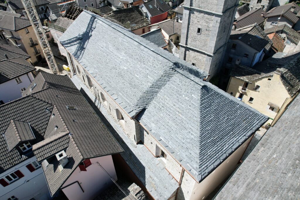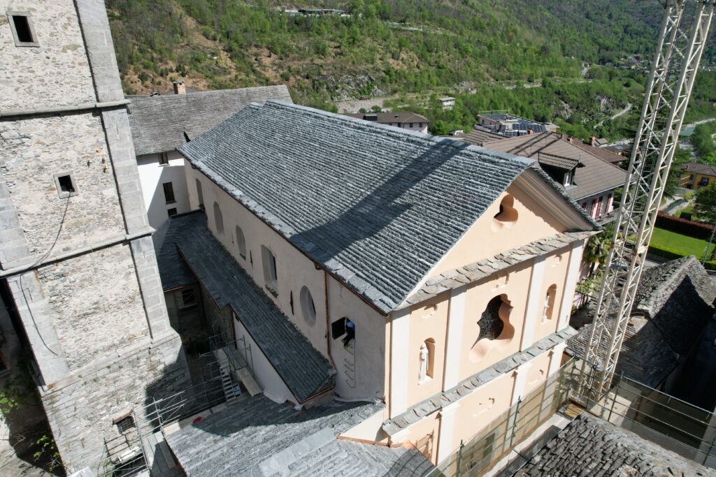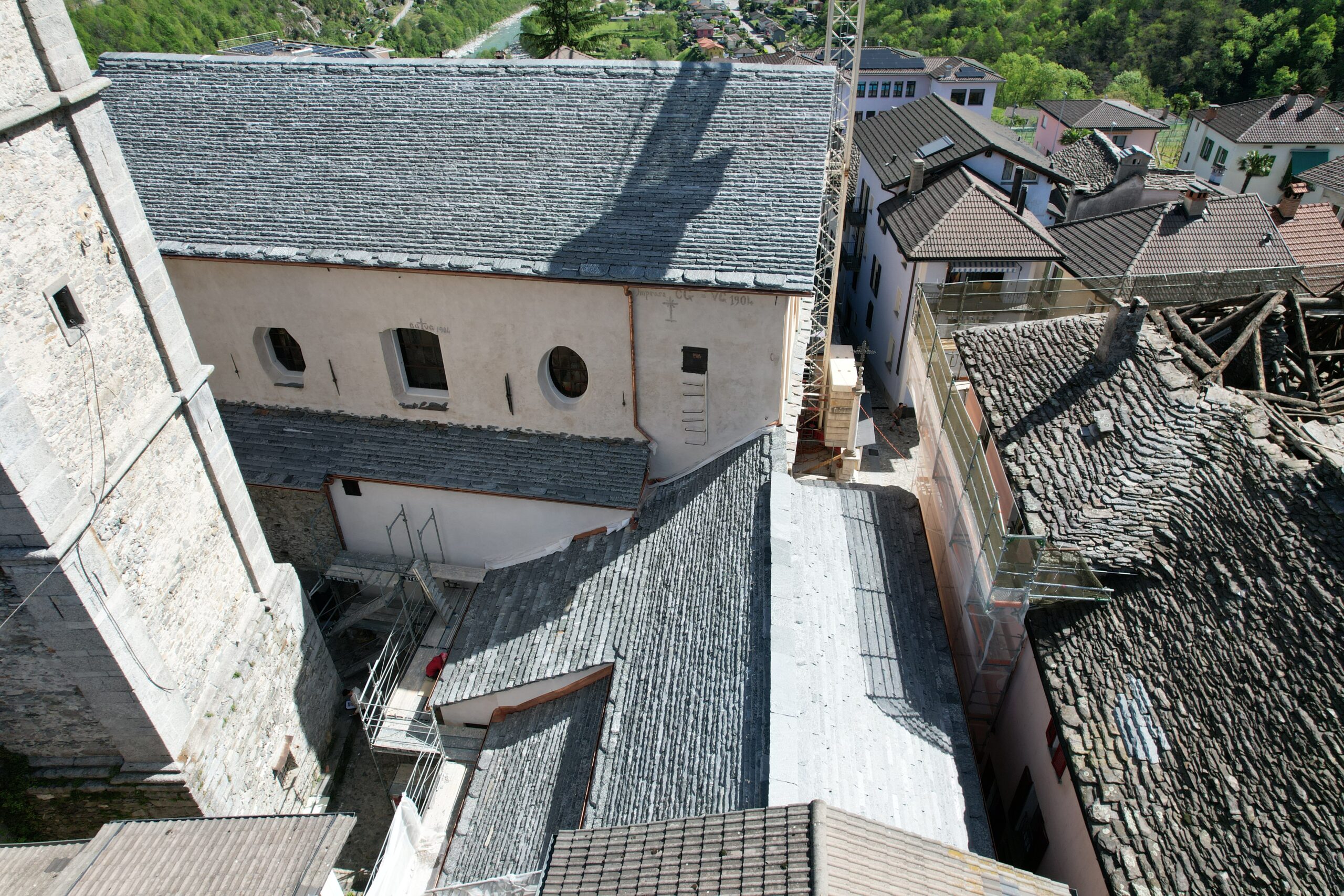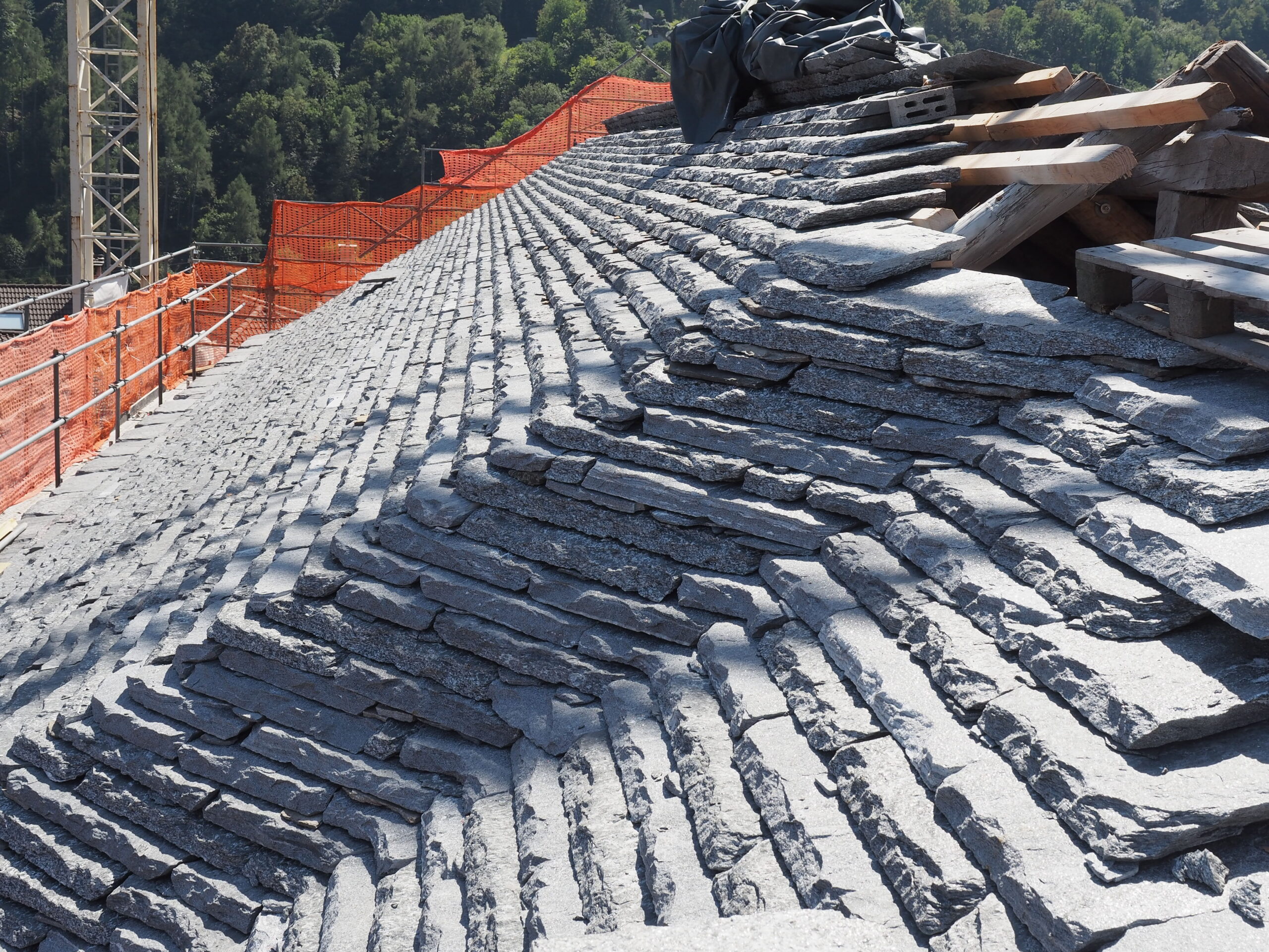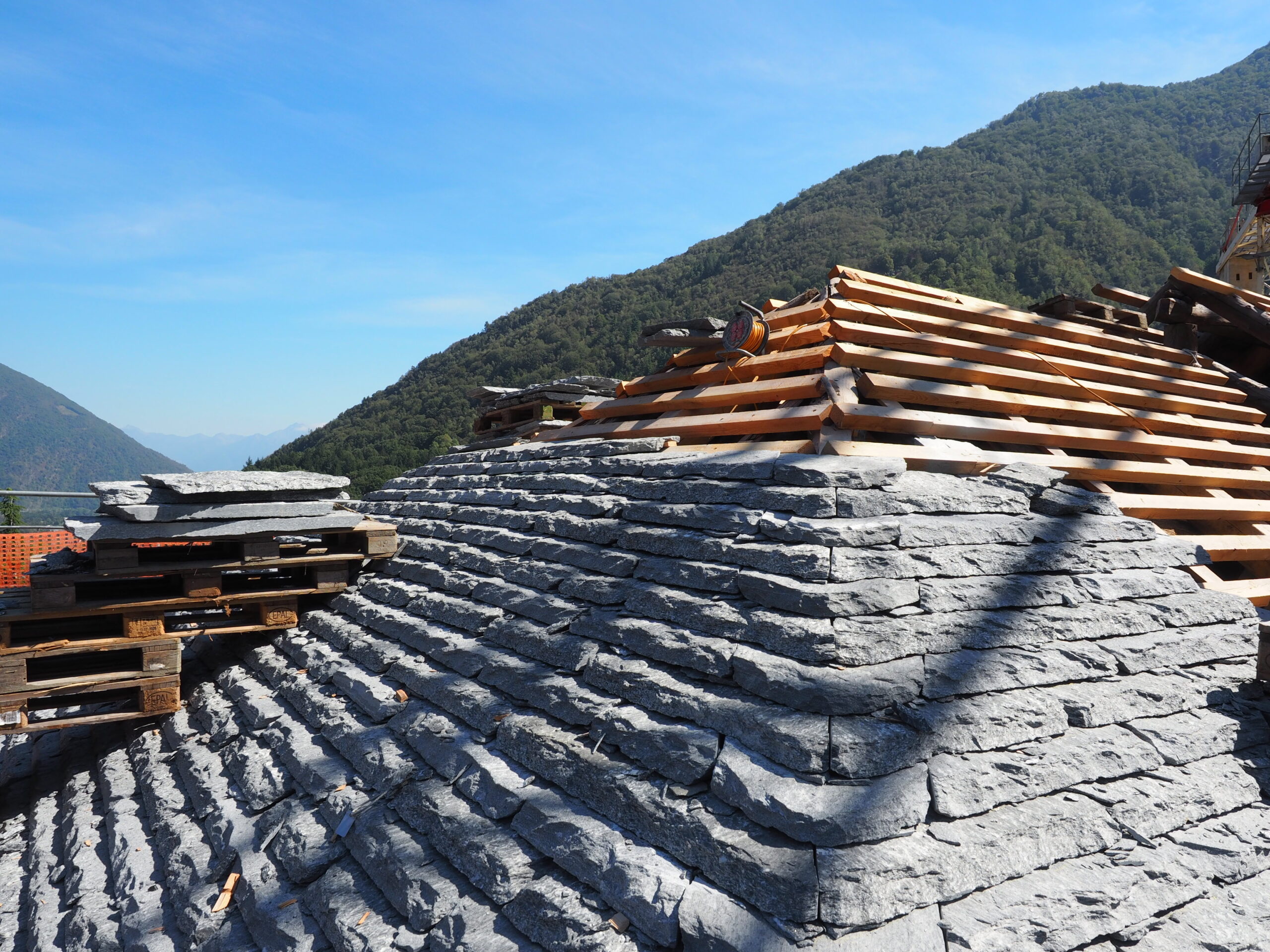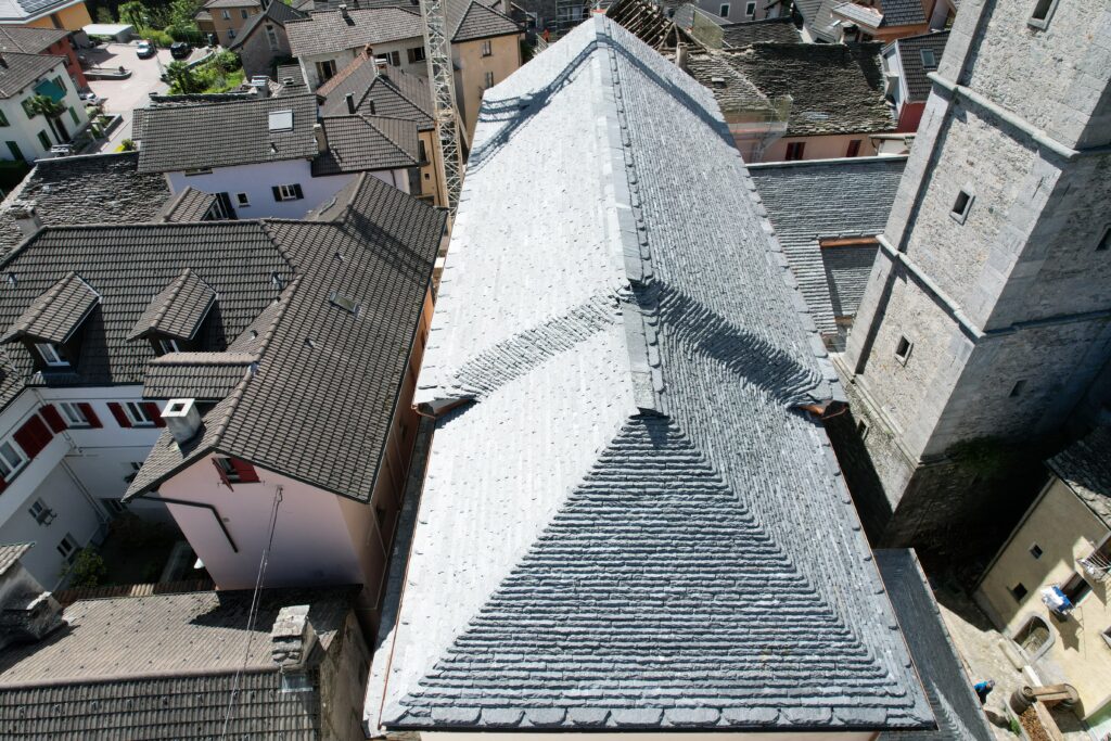 Tra i progetti più importanti realizzati dalla nostra impresa per il settore delle coperture in piode, il rifacimento del tetto della Chiesa di San Gottardo di Intragna rappresenta un intervento di rilievo per complessità e dimensioni. La copertura, con una superficie complessiva di 822 m², è stata oggetto di un accurato restauro volto a preservare il valore storico e architettonico dell’edificio. La carpenteria lignea è stata parzialmente restaurata con nuove travi in larice, garantendo solidità e durabilità alla struttura. La nuova copertura in piode è stata realizzata con ben 415 tonnellate di piode provenienti dalla Vallemaggia, lavorate e posate secondo la tradizione costruttiva locale. L’intervento ha richiesto un’attenta pianificazione logistica e un’elevata precisione esecutiva, nel pieno rispetto dei vincoli monumentali. Il risultato finale coniuga fedeltà storica, efficienza tecnica e qualità artigianale, restituendo alla chiesa un tetto destinato a durare nel tempo.