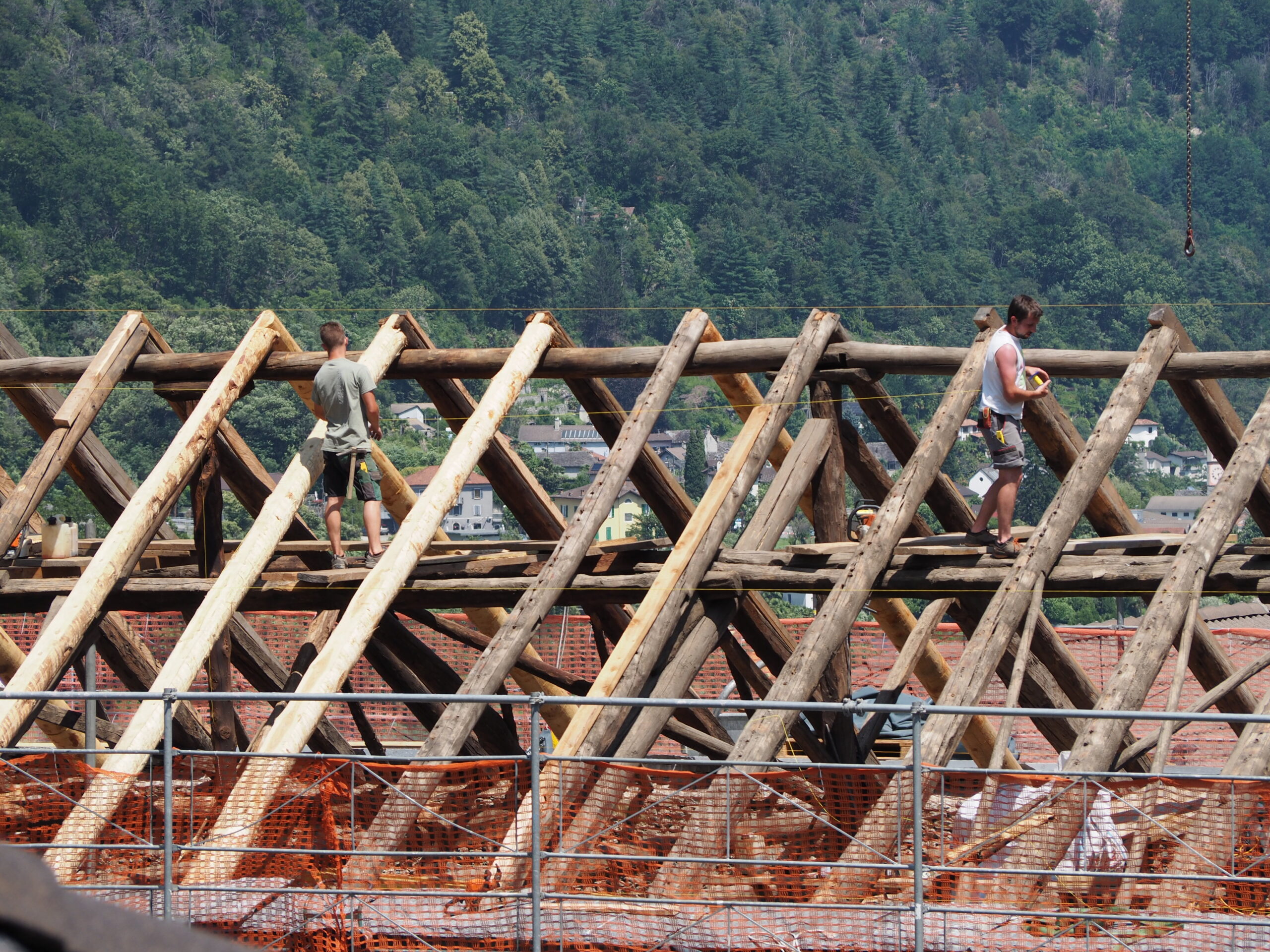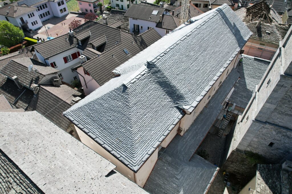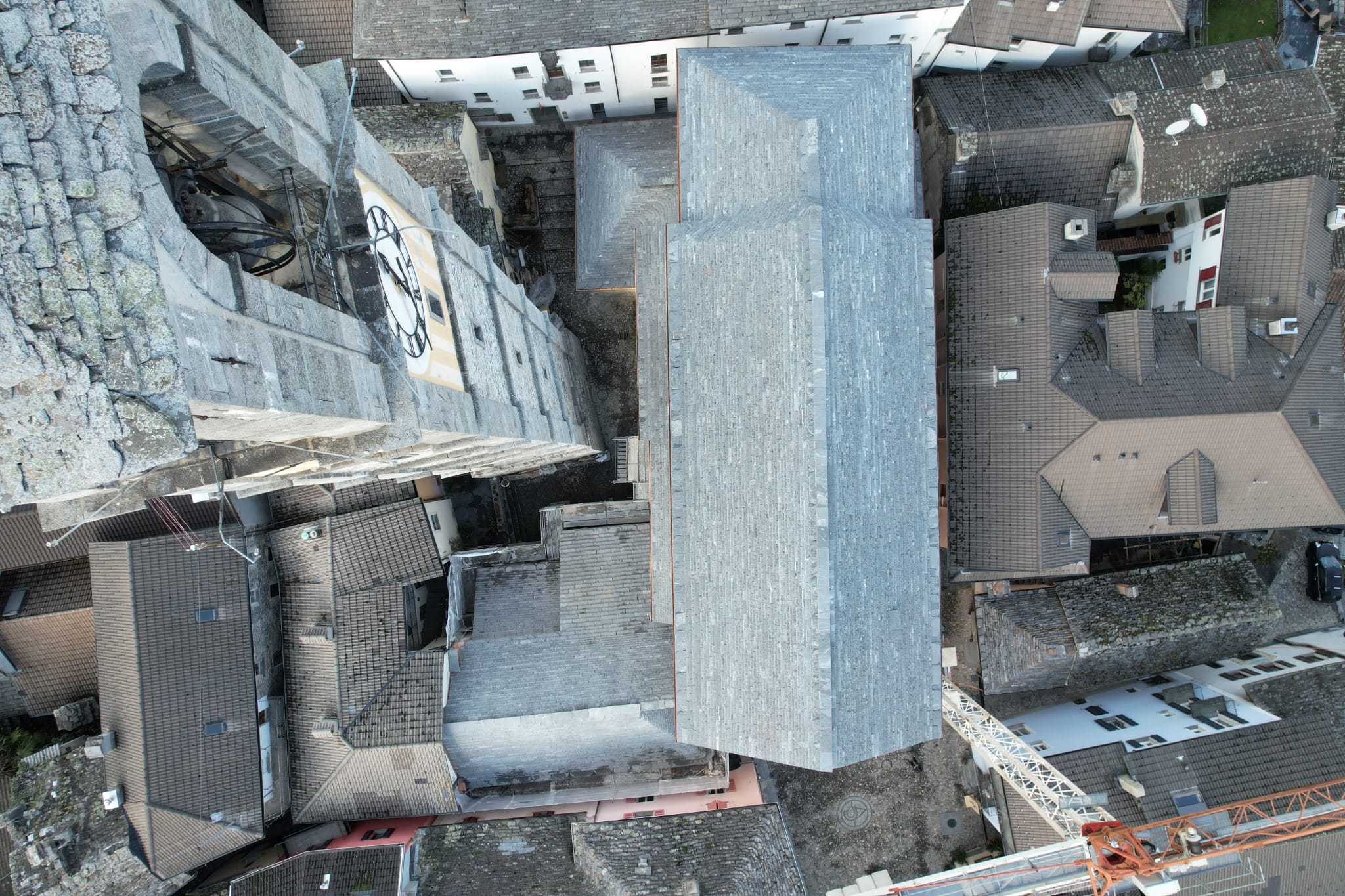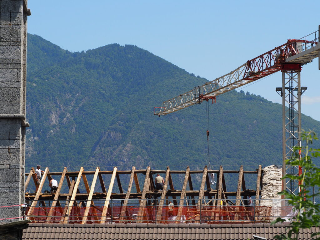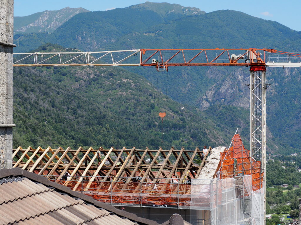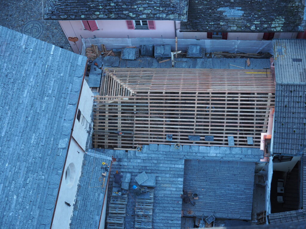 Tra i progetti più importanti realizzati dalla nostra impresa per il settore delle coperture in piode, il rifacimento del tetto della Chiesa di San Gottardo di Intragna rappresenta un intervento di rilievo per complessità e dimensioni. La copertura, con una superficie complessiva di 822 m², è stata oggetto di un accurato restauro volto a preservare il valore storico e architettonico dell’edificio. La carpenteria lignea è stata parzialmente restaurata con nuove travi in larice, garantendo solidità e durabilità alla struttura. La nuova copertura in piode è stata realizzata con ben 415 tonnellate di piode provenienti dalla Vallemaggia, lavorate e posate secondo la tradizione costruttiva locale. L’intervento ha richiesto un’attenta pianificazione logistica e un’elevata precisione esecutiva, nel pieno rispetto dei vincoli monumentali. Il risultato finale coniuga fedeltà storica, efficienza tecnica e qualità artigianale, restituendo alla chiesa un tetto destinato a durare nel tempo.