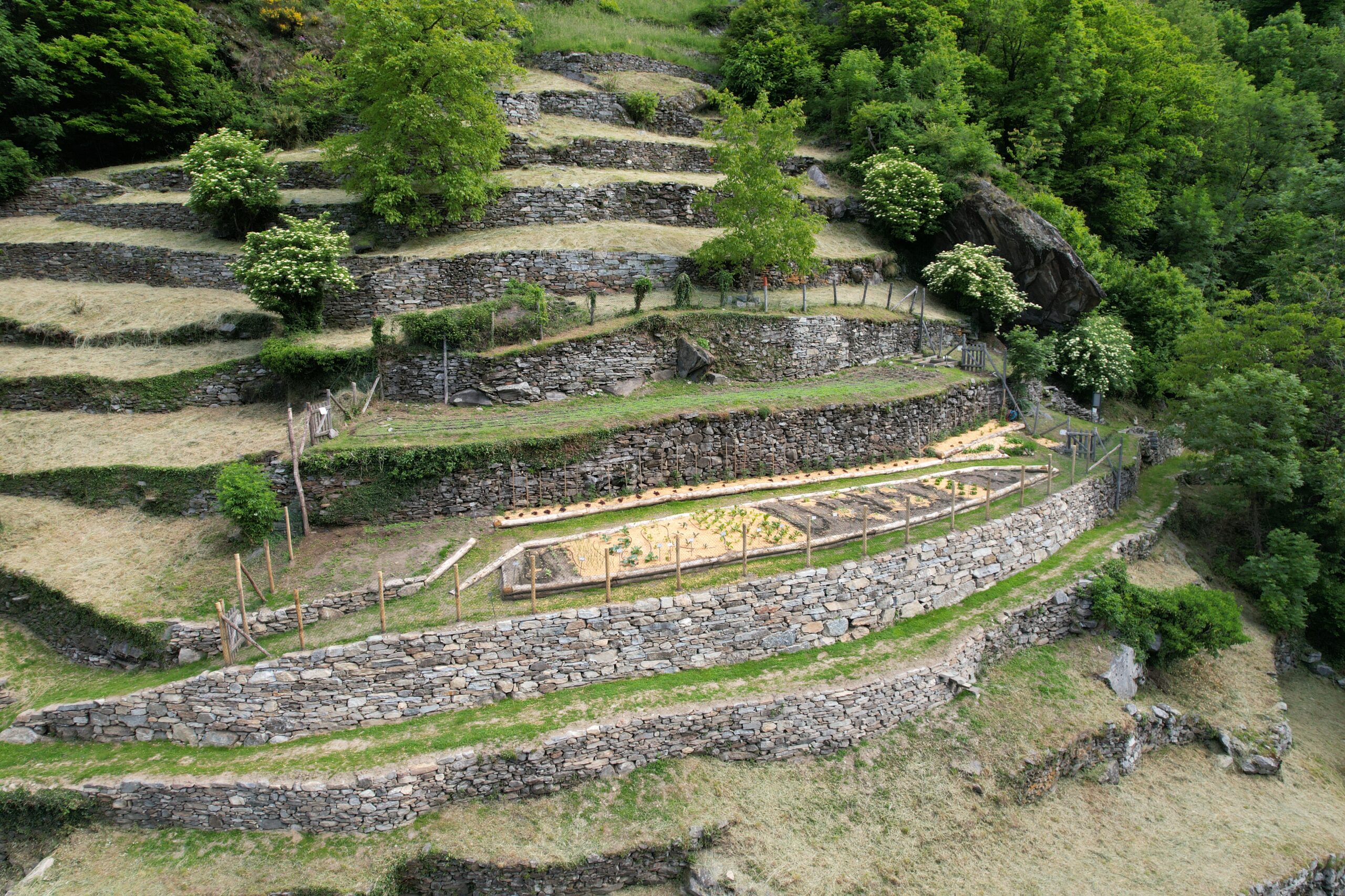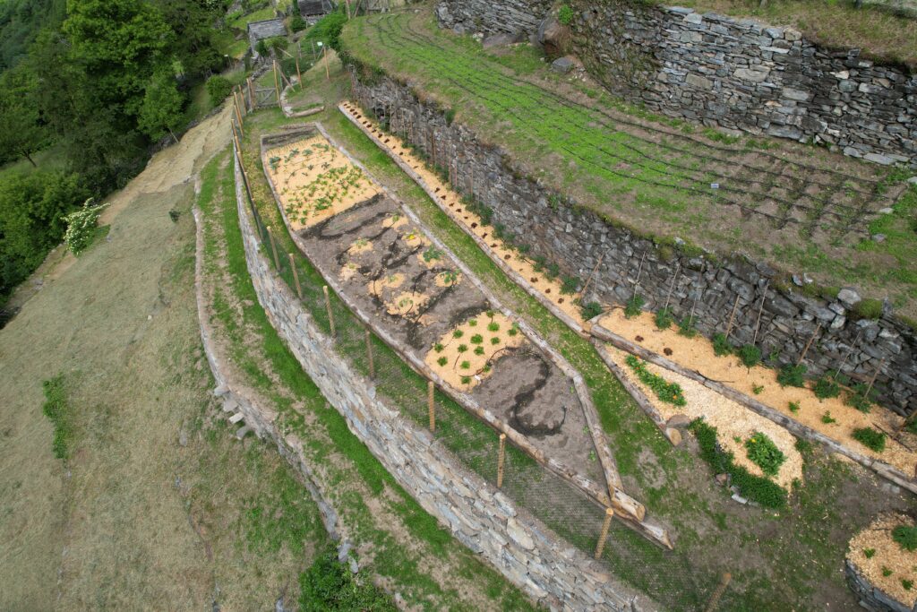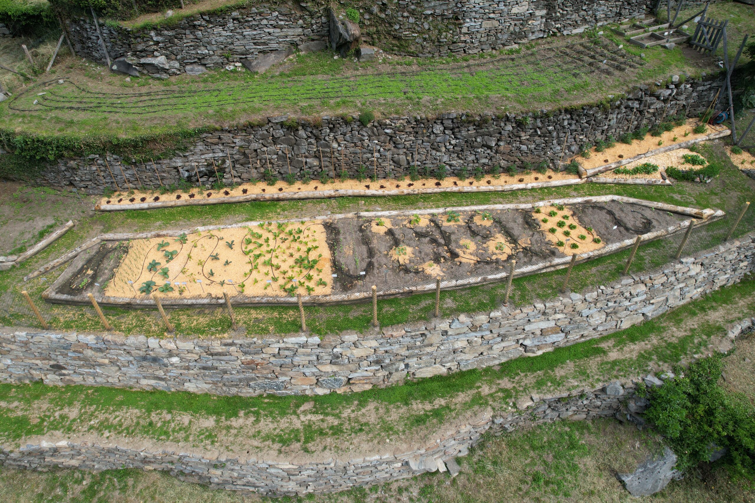Abbiamo eseguito il recupero di un terrazzamento con muratura in sasso a secco, valorizzando i tipici terreni terrazzati della regione e creando un orto didattico ProSpecieRara. L’intervento è stato pensato per preservare l’ingegno rurale locale, mettere in sicurezza il versante e restituire al terreno la sua funzione produttiva. Grazie alla scelta dei cassoni in tondo di castagno, per una maggiore comodità nella lavorazione, l’orto ospita specie vegetali rare, combinando conservazione della biodiversità, funzionalità agricola e armonia con il paesaggio alpino.